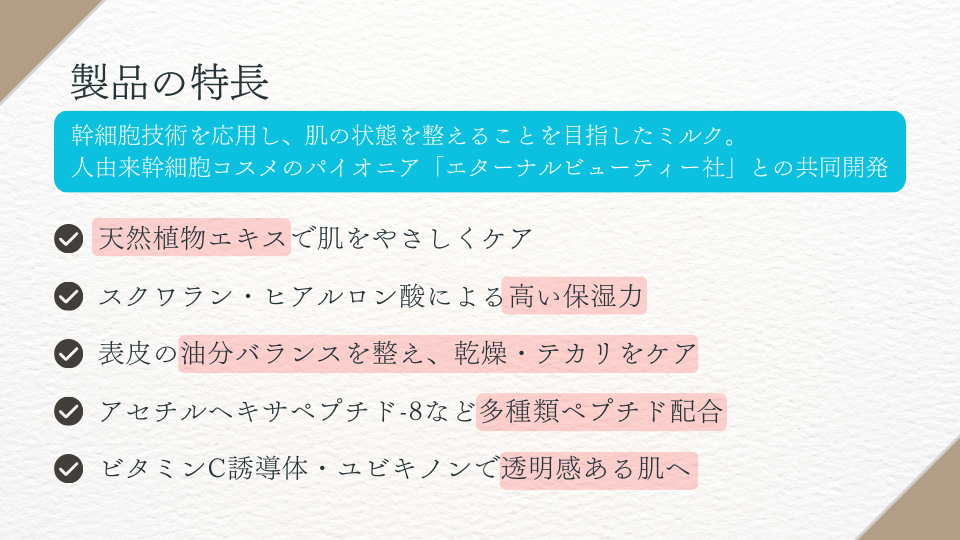 | 商品特徴 | ・人由来幹細胞コスメの先駆者「エターナルビューティー社」との共同開発により誕生したスキンリペアミルク。 ・表皮の油分を調整し、理想的な肌バランスへ導きます。 ・瞬時に肌表面を整え、化粧ノリをアップさせるため、化粧下地としても最適です。 ・日々の使用によりエイジングケアとしての効果も期待できます。 ・最先端の幹細胞由来成分や多種類のペプチドを配合。 |