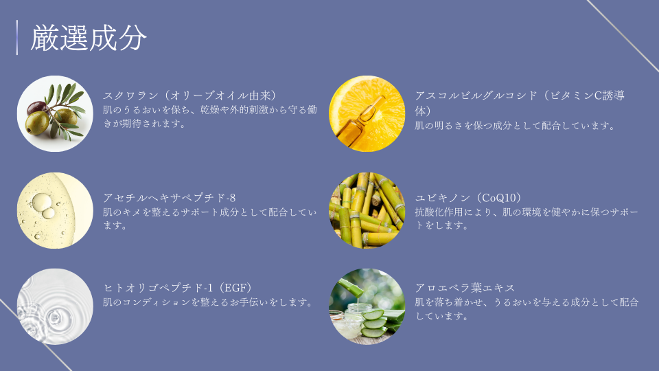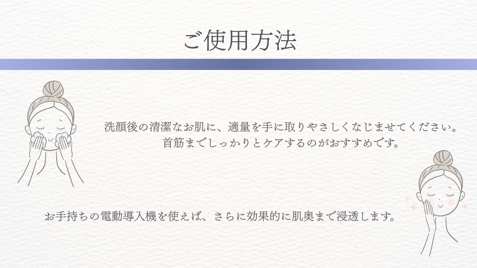 | 使用方法 | 洗顔後、清潔なお肌に適量を手に取り、顔や首筋にやさしくなじませてください。 電動導入機をご使用いただくと、より効果的です。 |